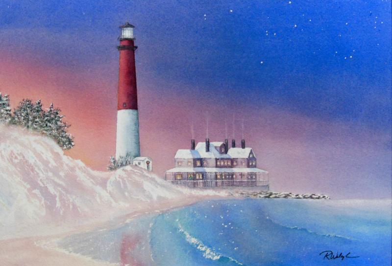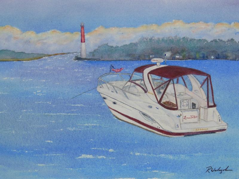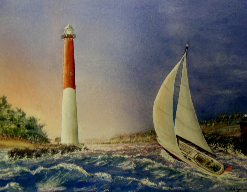Barnegat Lighthouse, "Old Barney" celebrated its 150th birthday a couple years ago. This painting commemorates what the lighthouse looked like in the early 1900's. Back in those days, there were high bluffs and a lighthouse keeper's house, and prior to its refrubishment, the cap on the top was black. The high bluffs and the keepers house have long since washed away by the relentless tide and rough seas associated with the Barnegat inlet. The sight of the lighthouse provides boaters with a comforting feeling as it guides us around dangerous shoals. Old Barney, an icon of endurance and guidance.