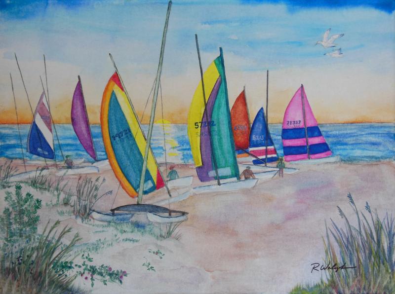 Sailboats on the beach (watercolor on canvas © 2013) - Just happened to see this colorful sight as the sailors prepare their boats for a morning of fun on the water.