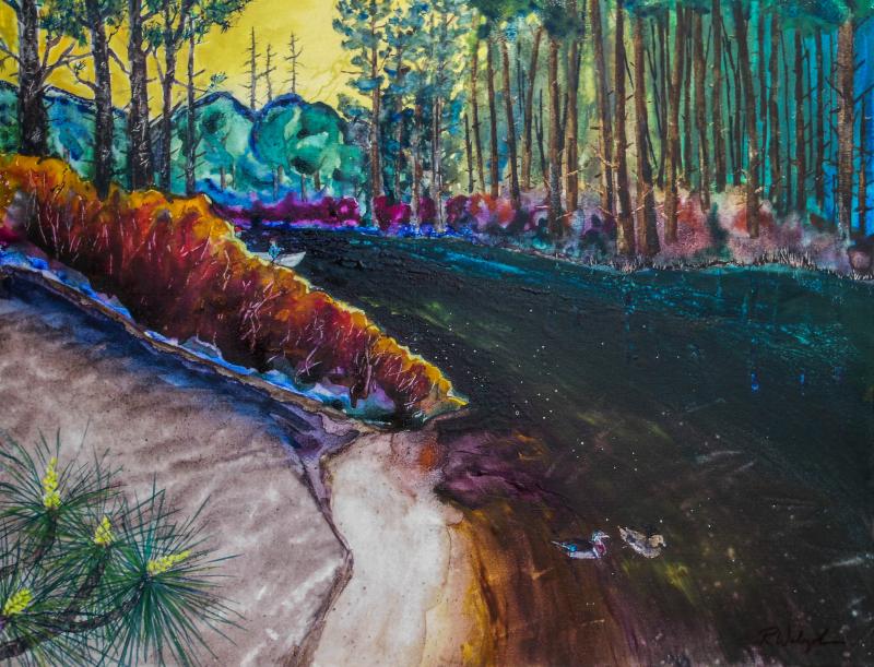 Paddling the Pinelands (watercolor on canvas ©2013) – canoeing on the numerous streams in the pinelands is something everyone should have on their “bucket list”. Peaceful and quiet except when a pair of wood ducks jumps as you round the corner. Huckleberries and other foliage provide vibrant color to the otherwise green scrub pine and brown cedar water. This painting style is a bolder use of thick, vibrant watercolor paint.